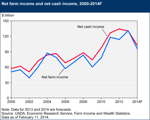 Commodity prices across the board are clearly under pressure. The USDA projects that 2014 crop receipts will fall at least 12% year over year. Worse yet, government payments could drop a whopping 45% this year. That would be a major blow to farm receipts and income.