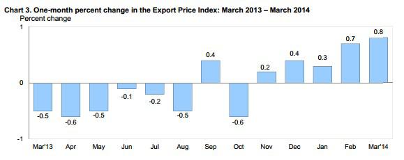 Import and export prices were both up for March, according to a Labor Department report (link opens as PDF) released today.