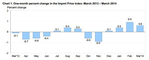 Import prices increased 0.6% for March after a 0.9% hike in February. Analysts had expected just 0.2% price growth. More expensive fuel (up 1.2% due primarily to a 21.7% jump in natural gas prices) played a part in the price increase, but so did nonfuel prices, up 0.3%. Despite the rise, import prices are still 0.6% below March 2013 levels.
