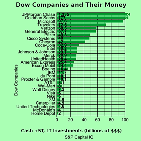 I pulled data from S&P Capital IQ to shine some light on the Dow's cash reserves. This chart covers each of the 30 Dow members' cash equivalents, plus short-term and long-term investments: