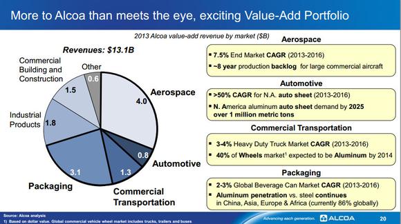 Last year Alcoa produced $13.1 billion in revenue from its value-add segments. That revenue is only expected to grow in the future. While the automotive segment will be a big driver, it's just one of four segments Alcoa sees driving revenue growth. As the following slide shows, aerospace, commercial transportation, and packaging will all enjoy single-digit compound annual growth through the next few years.
