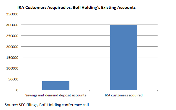 It's one thing to acquire deposits. It's another to acquire customers. BofI Holding management asserts that it can cross-sell new products to the 300,000 IRA customers, which could lead to new deposits and better mortgage originations for the online bank.