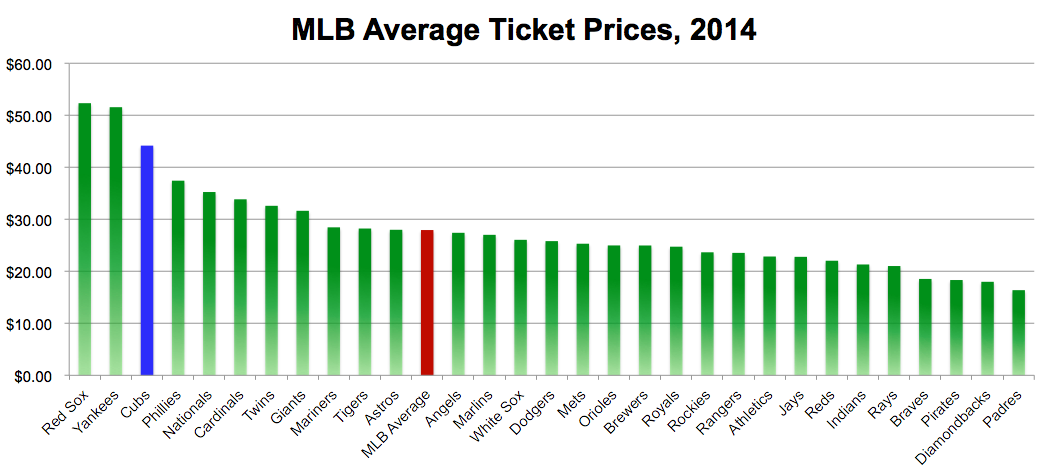 Still, it's too early to tell how these efforts will affect ticket sales. Fansided reports prices are down a little over 5% from 2013, while Team Marketing Report calculates a 0.9% decline. According to the latter, though, a seat at Wrigley Field still costs more than 27 other MLB teams. At an average of $44.16, the Cubs are behind only the Boston Red Sox and the New York Yankees in terms of price.
