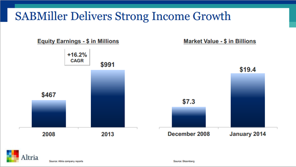 What's more, considering the fact that Altria's initial investment in SAB was $6.5 billion, an income of $991 million for fiscal 2013 indicates an annualized return on investment of 15.2% -- not bad.