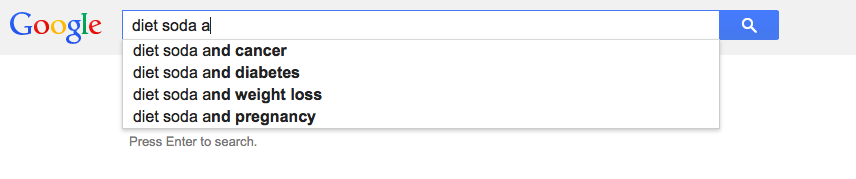 And the perception is growing that diet sodas are not particularly safe. In my recent Internet search of the term "diet soda and ..." Google's top suggested way to finish that query was "diet soda and cancer," followed by "diet soda and diabetes." I think I just lost my appetite.