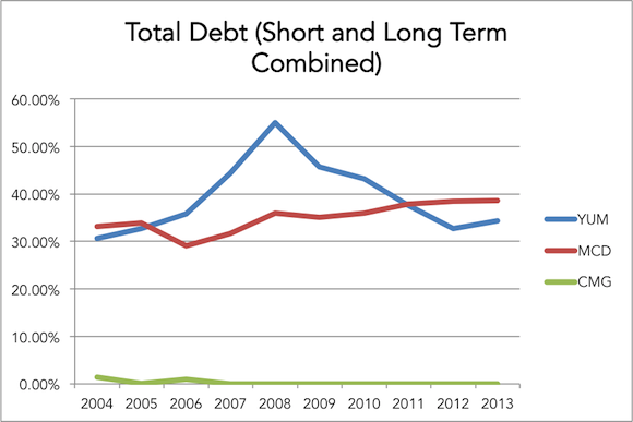 Now consider Chipotle, a company with no debt and an ROE of just around 23.5%. Sure, its ROE looks low in comparison with the likes of Yum! and McDonald's, but the lack of debt decreases the burrito maker's risk and ensures that the company isn't biting off more than it can chew. Sure, if it took on some debt Chipotle would be able to expand its operations. However, the company has opted for a more cautious approach by staying slow and steady in its growth.