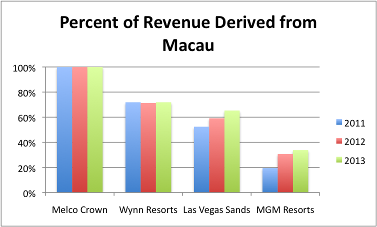Las Vegas Sands is also a power player in the region. In 2013, the company reported that 65.3% of its $13.8 billion in revenue, which converts to $9 billion, came from Macau. This is up from 52.4%, or $4.9 billion, in sales seen during the company's 2011 fiscal year.