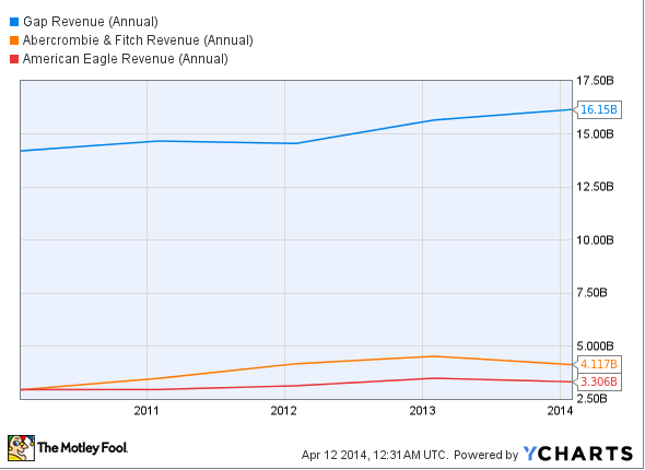 Right now, Gap's picture may not look great to Mr. Market, but the Foolish investor would be wise to consider the company's shares as a prospect. Yes, the company's top line has been hurt slightly this past month but its long-term performance suggests that its management has been doing something right. In contrast, American Eagle's situation looks anything but good because its profits have fallen off a cliff, while Abercrombie & Fitch's revenue growth has been appealing but it seems to have hit an inflection point.