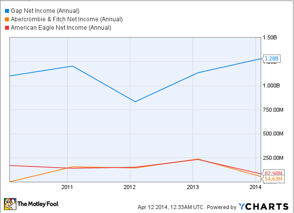 Abercrombie & Fitch has done the worst in comparison with its peers. Between 2009 and 2013, the company's net income skyrocketed from $0.3 million to $54.6 million. While this looks good, investors should keep in mind that the business booked a net loss from discontinued operations in 2009 that amounted to $78.7 million.