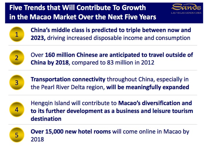 Las Vegas Sands (LVS 1.45%) executives have pointed to five trends that will lead to continued growth in Macau over the next five years. The third trend on the list, the rapidly developing transportation infrastructure in the region, is gearing up to provide customer and profit growth for casino companies in the area like Las Vegas Sands, MGM International (MGM 0.11%), Melco Crown Entertainment (MPEL 2.52%), and Wynn Resorts (WYNN 1.02%).