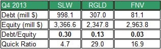 Another issue to consider is the level of financial risk that each company incorporates. As of the last quarter of 2013, Silver Wheaton's debt-to-equity ratio was the highest of the three at 0.3. Conversely, Franco-Nevada's ratio is the lowest, at 0.03. This means that the burden of debt Franco-Nevada holds is the lowest of the three; in other words, the company holds the least financial risk from its balance sheet point of view. Another measure worth noting in this respect is the quick ratio, which is a crude measure of a company's ability to cover its short-term liabilities in case of need. Because this measure doesn't consider a company's working capital, it should be taken with a grain of salt.