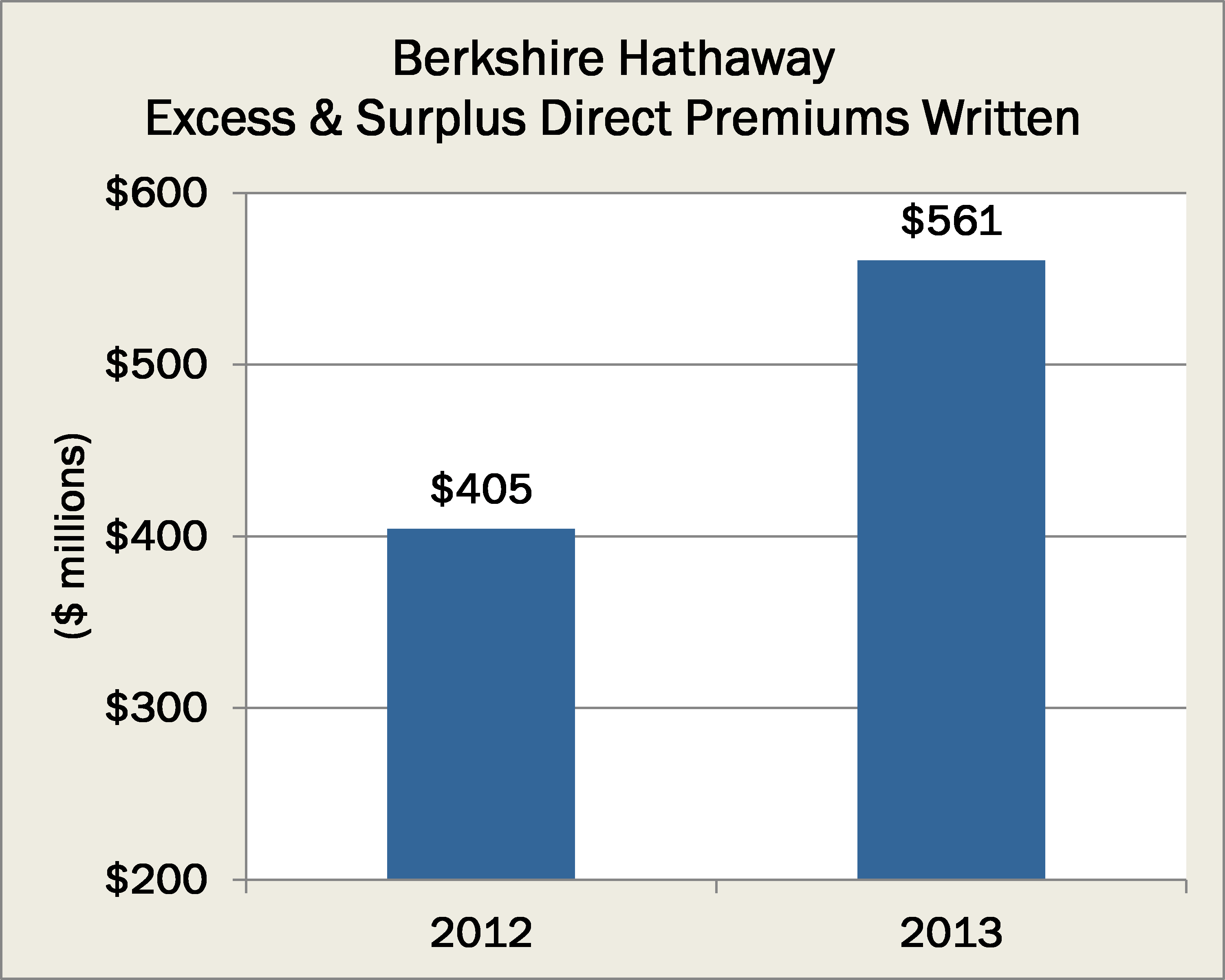 All too often, companies will approach new businesses with the grandest ambitions but ultimately the results won't match the lofty goals, however that has not been the case for Berkshire Hathaway. SNL, a provider of market data, reported Berkshire Hathaway grew its excess and surplus premiums in 2013 by 40% moving from $404 million to $560 million.