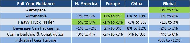 The following table provides an update on Alcoa's end market guidance for 2014 vs. 2013. The sections in green are where guidance was upgraded from the previous quarter.