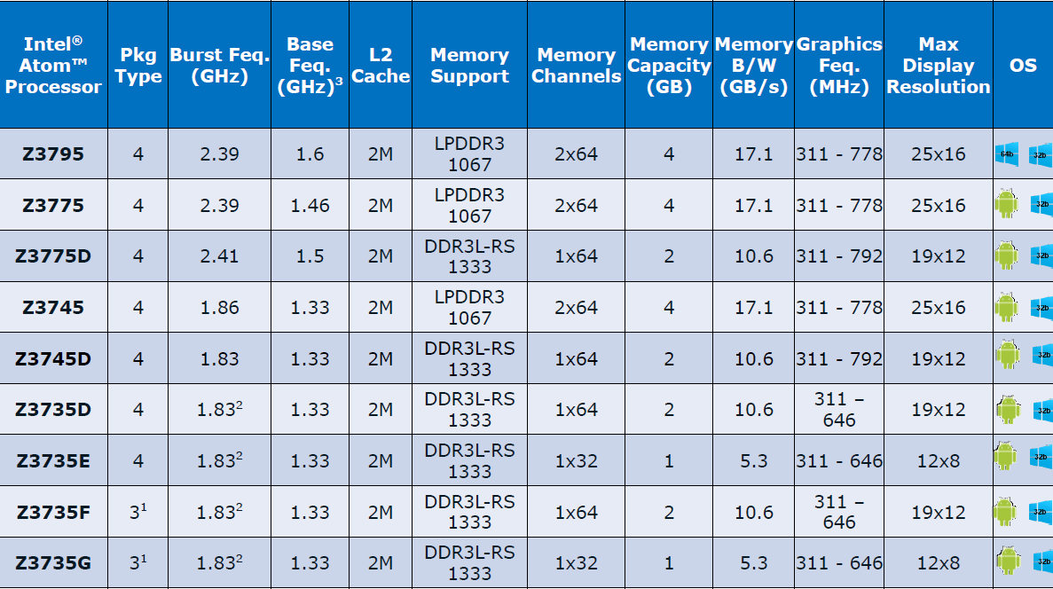 The very top model is able to run all four CPU cores at 2.39 GHz and the graphics engine at 778 MHz. But the Z3735F and Z3735G, which are presumably the models that Intel is selling for dirt cheap, offer significantly lower memory bandwidth, a top four core CPU turbo of 1.58 GHz (two cores can run at up to 1.83 GHz), a graphics engine that maxes out at 646 MHz, and lower maximum display resolutions.