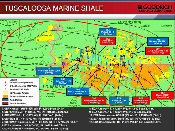 With more than 300,000 net acres in the Tuscaloosa Marine Shale Goodrich Petroleum has built a massive position in this emerging oil play. It is among the early leaders in developing the play along with Encana (ECA 1.74%) and Halcon Resources (HK +0.00%). As the following slide shows the exceptional results of this new wells really looks like it will extend the play to the south.