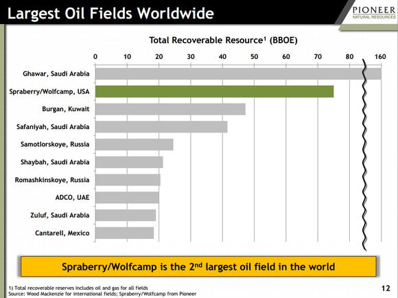 Meanwhile, producers are using the combination of horizontal drilling and hydraulic fracturing that was the key to these two shale plays in new areas all across the country. In the Permian Basin, for example, Pioneer Natural Resources sees this combination being the key to unlocking upward of 75 billion barrels of oil equivalent, which is 25 billion barrels of oil equivalent more than the company thought the industry would recover just last year. As the following slide shows, Pioneer Natural Resources believes that it's sitting atop the second largest oilfield in the world.
