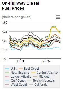 At these latest prices, the West Coast pays the prettiest penny for gasoline ($3.977), while the East Coast dishes out $4.068 for diesel. On the other end, the Rocky Mountain region can guzzle gas for just $3.438 as the Gulf Coast grabs diesel for $3.790 per gallon.