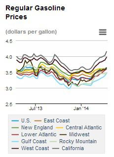 Retail regular gasoline prices clocked in at a national average of $3.651 per gallon for April 14, $0.055 above the previous week's price tag. The Rocky Mountain region was the only area to see prices drop (-$0.008), while West Coast prices jumped $0.097.