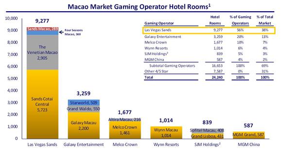 Not only that, but the company is an undisputed leader in Macau. Management estimates that Sands' market share in terms of hotel room inventory is bigger than the share of the following five gaming operators combined.