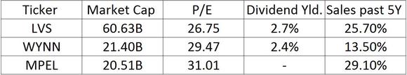While Melco Crown is the growth leader among the group, Las Vegas Sands has materially outgrown Wynn Resorts on a total revenue basis in recent years. However, the stock is priced at a discount to both Melco Crown and Wynn Resorts.