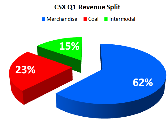 Splitting CSX into its three business segments -- merchandise, intermodal, and coal -- the first two segments provided enough revenue growth to offset continued weakness in coal.