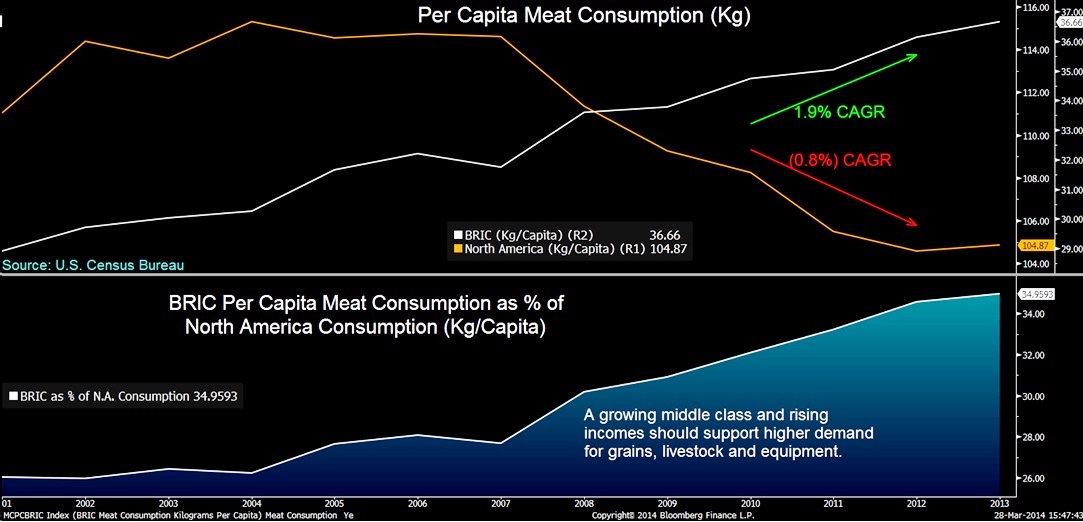 Meat comes from animals or livestock, and livestock live on feed. Grains serve as an important feed. Farmers grow grains. And farm machinery helps in not just raising these crops, but also in increasing yield. So, demand for more meat actually pushes up demand for farm equipment -- and demand for meat is on the rise in BRIC countries. This is a huge opportunity for Deere.