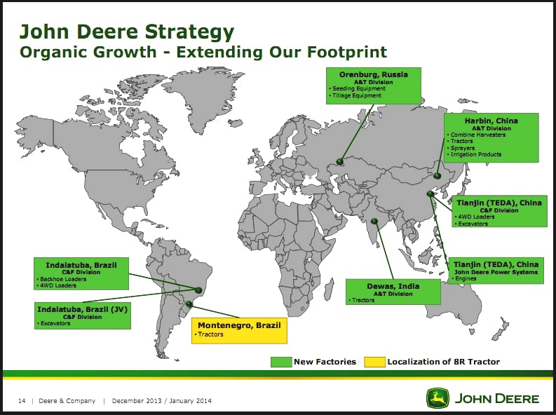 Deere has stepped on the gas to tap the overwhelming opportunities and grab bigger market share. In the past couple of years, it has opened six factories in the key BRIC markets. The company has adopted a differential approach depending on the needs of each country.