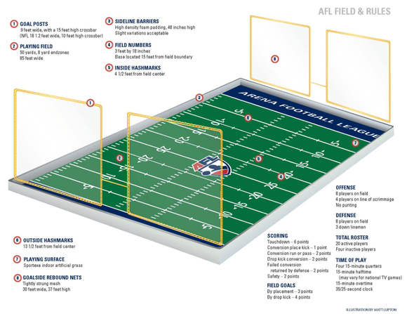 For the uninitiated, arena football is the higher-paced, equally as exciting cousin of the NFL. Originally patented in 1990, its field is 50 yards long, bordered by padded walls, with enormous nets in each end zone.