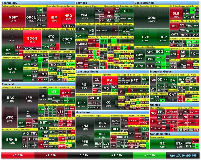 Now with computers, we can use far more rigorous methods to get accurate measures of the stock market and economy. The S&P 500 (^GSPC +0.69%) is weighted by the market capitalization (size) of its 500 companies. As the below map of the S&P 500 from Finviz.com shows, the relative size of the square is the relative weight of each company. If you look closely, you might be able to see Visa (V) at the top of the map in between Dow stocks Wal-Mart (WMT) and ExxonMobil (XOM).