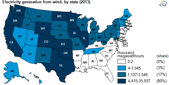 And it's not just NextEra Energy that's a picky producer. New data from the U.S. Energy Information Administration shows that a whopping 80% of 2013 wind energy came from just 12 states. While the Midwest and West Coast easily take the cake for wind power, it's Texas that grabs gold.
