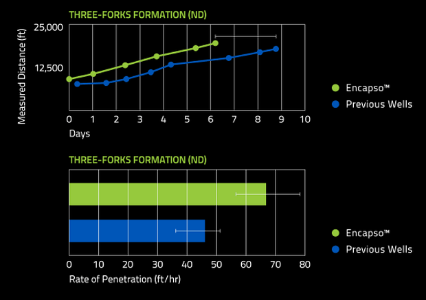 Additionally, it provides engineers with a targeted friction reduction tool that reduces torque needed to break resistance. In a field test in the Three-Forks Formation, Encapso increased the rate of penetration by over 44% and allowed engineers to drill further in six days than could be achieved previously in nine days. Significantly reducing the energy needed to drill each well will give Encapso a major advantage in the competitive oil and gas drilling markets.