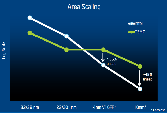 The problem here is that when competitors move to their first FinFET nodes, they will actually be moving to the 14/16nm node, which should offer better density and better performance per transistor than the current Intel 22-nanometer process. Of course, Intel will get to its own 14-nanometer first (which Intel claims has a performance and density advantage over competing 14/16nm processes) in late 2014, but the idea that Intel is "3.5 years ahead" with 22-nanometer parts seems absurd.