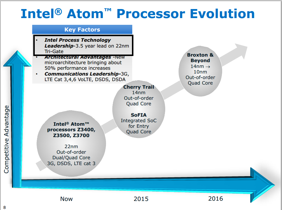 Here, Intel is claiming that it has a "3.5 year" on 22-nanometer tri-gate. While it is technically true that Intel shipped its first commercial 22-nanometer tri-gate based products in late 2011, and while it is also true that competitors are likely to ship their first FinFET-based (this is the non-marketing term for tri-gate) designs in late 2015/early 2016, this does not imply that Intel was able to capitalize on this lead in mobile as suggested in this slide.