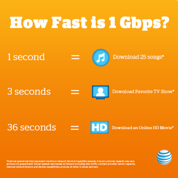 The press release highlighted the reason behind this was to allow both consumers and businesses the ability to use the capabilities of the AT&T U-verse with GigaPower fiber technology to outpace current Internet speeds provided by cable and other solutions. As shown in the chart to the right, the GigaPower service can deliver speeds up to 1 gigabit per second, which could allow for up to 25 songs to be downloaded in a second.