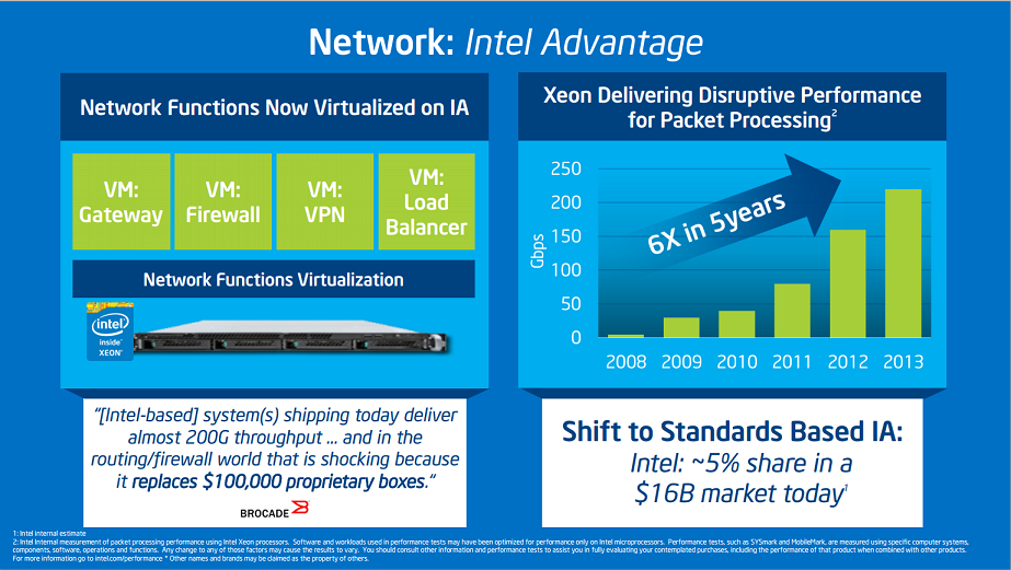Intel is the incumbent in the server market and is currently very aggressively attacking the network chip space, a market in which it has just 5% market share (but growing). The company's product stack, from the very highest enterprise servers serviced by the Xeon E7 to these micro-servers serviced by Avoton/Denverton and Broadwell SoC, is quite compelling. It will be extremely difficult for competitors to attack Intel's core server market head on, and Intel's progress in networking is quite encouraging.