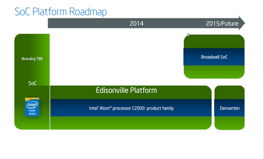 We can see that Intel intends to use the Atom C2000 (Avoton) family for the entirety of 2014 before transitioning to the next-generation Denverton part in what looks like early 2015. Denverton will be built on Intel's 14-nanometer process and is likely to up the cores, the integration, the memory bandwidth, and so on. However, what's more interesting is that the big-brother micro-server part that integrates Intel's "big" core looks set for a late 2014 or early 2015 launch.