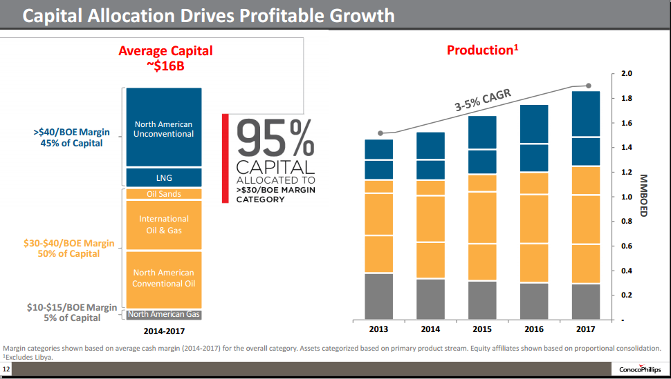 ConocoPhillips (COP +0.61%), the world's largest independent exploration and production company, has the ability to grow production and margins by 3%-5% annually, which should enable the company to self-fund its capital expenditures and grow dividends at a healthy rate. Contrary to what bears would say, the company is proving it can grow production via U.S. legacy unconventional projects and new projects while supporting dividend growth.