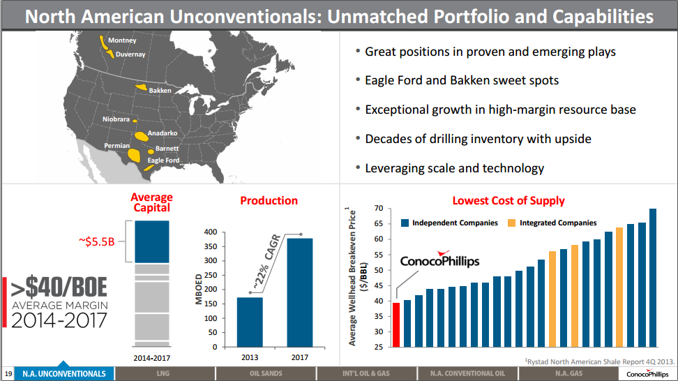 ConocoPhillips is actively taking steps to drive production growth of high-margin barrels. I think the market does not fully appreciate the growth potential of the company's acreage in North American unconventional plays. Conoco remains confident in its ability to meet production targets and eventually generate strong cash flow. While the company should have a strong 2014, Conoco is looking at a stronger 2015 as larger projects come online and the contribution from shale rises.