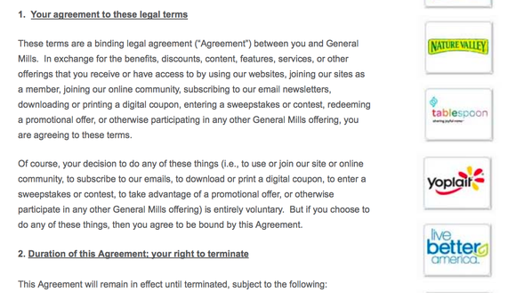 Below are screen captures of General Mills' previously revised policy in which it said that those who voluntarily participated in or engaged with the company, including people who "use or join our site or online community," became bound by those legal terms. So you tell me if it was a "mischaracterization" or that the policy was "misunderstood."