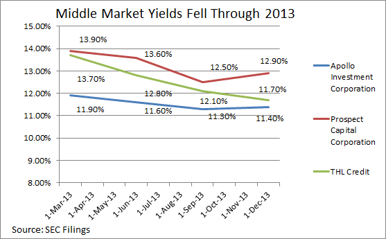 In the past year, so-called "hot money" has driven down yields. Apollo Investment Corp's average yield on its portfolio fell .5 percentage points, from 11.9% to 11.4%, in the last four quarters. Likewise, Prospect Capital's average yield fell a full percentage point in just three quarters, from 13.9% to 12.9%, during March 2013 to December 2013.