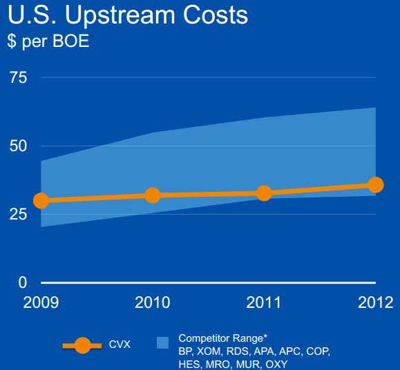 Indeed, for 2013, Chevron reported the higher adjusted earnings per barrel of oil out of any of its peers, as seen in the chart below, and the company also reported costs per barrel of oil extracted at the lower end of the range for the region, also shown below.