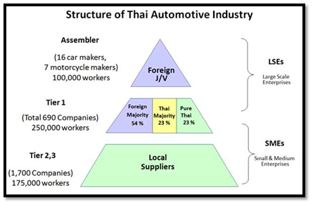 Thailand's cheap labor, quality advantages, and an established supply chain make manufacturing inexpensive fuel-efficient models that could be sold regionally, and also exported to other countries, lucrative. The automobile industry presently accounts for 12% of the country's GDP.