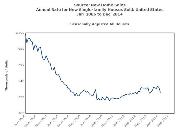 New single-family home sales plummeted 14.5% to a seasonally adjusted annual rate of 384,000 for March, according to a Commerce Department report (link opens a PDF) released today. After February's rate was revised up 9,000 to 449,000, this latest report delivers a major blow to the purported housing market recovery. Analysts had expected growth, predicting March's annual rate to clock in at a strong 455,000.