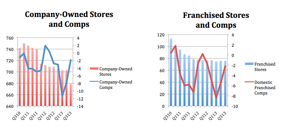 As the above charts show, we've heard this refrain before. Ruby Tuesday has been rationalizing its store base, both company-owned and franchised, for a while; yet, despite new menus, regardless of whether one new concept chain has been swapped out for another -- Marlin & Ray's, Wok Hay, and Truffles Grill were seen as holding high-growth potential, but ended up cannibalizing its Lime Fresh Mexican Grill so they were killed off -- same-restaurant sales remain in negative territory.