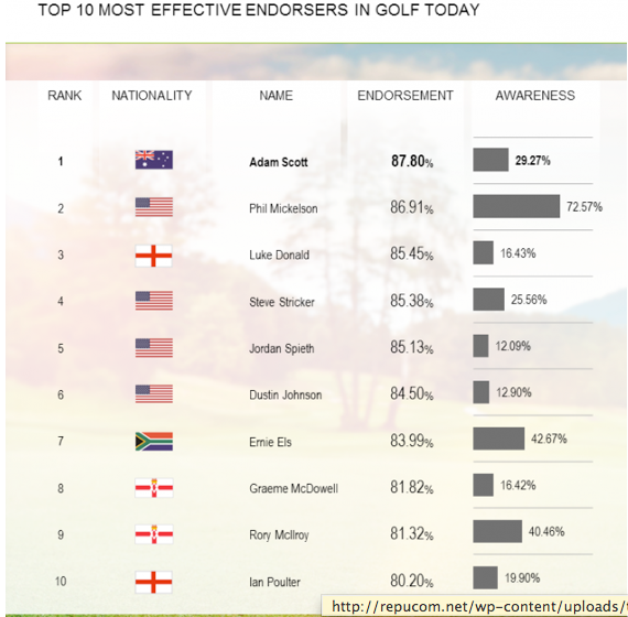 Here's an interesting thing about Woods. Research by Celebrity DBI, Repucom's sports-marketing research division, shows Woods is one of the most recognizable (98% in U.S. and 80% in the world) and least trusted (bottom 5%) celebrity product endorsers. Adam Scott, who won the 2013 Masters, leads the golfing endorsers, winning the trust of nearly 88% of people in the U.S., followed by Phil Mickelson (86%), who did his part to add to this year's Masters' rating woes by missing the cut. Masters' runner-up Jordan Spieth (85%) garnered great exposure for Under Armour (UA +2.64%) and came in ahead of Nike's other golf pitchman, Rory McIlroy (81%), as a trusted endorser.