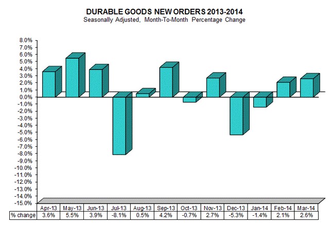 New orders for durable goods jumped 2.6% to $235 billion for March, according to a Commerce Department report (link opens as PDF) released today.