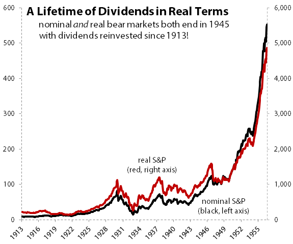 With dividends, the picture changes significantly. An investor who started young enough -- say, at the age of 18 in 1913 -- might have lived to see his holdings grow far larger than the values reported for the Dow or the S&P by the first decade after World War II. Not only does the nominal S&P composite reach a new high in 1945 when dividends are reinvested, the real S&P does as well, in the same month! Reinvesting dividends from 1913 onward shaves nine years off of the S&P's nominal bear market, but it cuts 14 years off of an inflation-adjusted bear market.