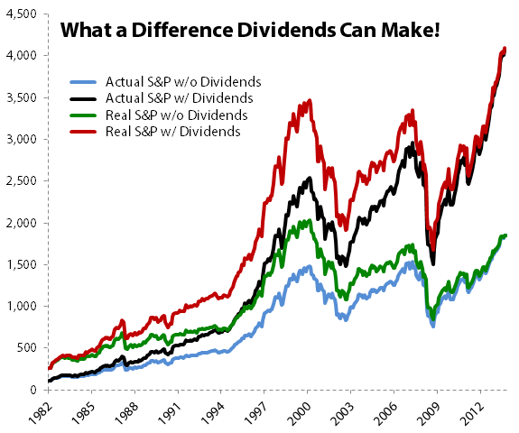 Before factoring in dividend reinvestments, we find that inflation shaves off a full 1,000% of the 1,600% a buy-and-hold investor in the S&P would have gained in nominal terms from 1982 to the present day. However, when you let reinvestment work its magic, an investor's real returns nearly pull even with (nondividend-adjusted) nominal returns -- from 1982 to 2014, a consistent reinvestment strategy with the S&P 500 has yielded gains of 1,440% after inflation.