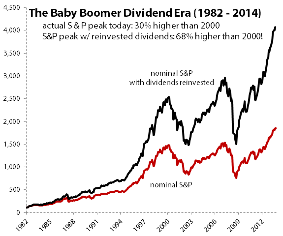 Why should that matter to today's investors? Few who read this today are likely to have been serious investors for more than three decades -- millions of baby boomers (the largest and wealthiest investing demographic) began buying stocks in the 1980s, helping fuel the boom that eventually pushed the inflation-adjusted Dow and S&P past 1929 for good. In nominal terms, buy-and-hold types who merely followed the S&P's path since 1982 (when the real growth began) have done quite well. Their investment, dollars to dollars, is worth 1,600% more after roughly 33 years of simply holding on. But with dividends in the picture, those gains jump to over 3,600%. The difference between reinvested dividends and no dividends at all also makes quite a difference in how investors might view the supposed weakness of the post-dot-com period:
