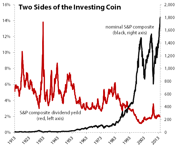 A major source of that outperformance is the dividends most large public companies pay to their shareholders. Over the past century, the aggregate dividend yield of companies in the S&P 500 (^GSPC +0.19%) has very rarely slipped below 2%, and in recent years that yield has actually moved into line with the yields on U.S. Treasuries. In fact, until the 1950s, the S&P composite -- a data set compiled by Nobel Prize-winning Yale economist Robert Shiller that dates back to 1871 -- regularly boasted higher yields than 10-year and longer-term Treasuries, and higher yields than investment-grade corporate bonds as well. The steep decline in the S&P's aggregate yield since the 1980s also coincided with one of the strongest periods of share-price growth in American market history: